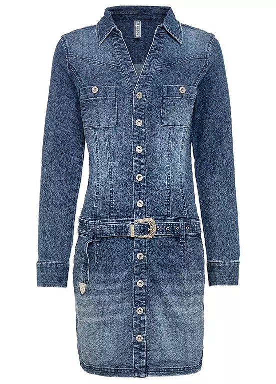A stonewash denim dress with chest pockets and a belt. Machine washable. 82% Cotton, 17% Polyester, 1% Elastane. Length approx. 90 cm.