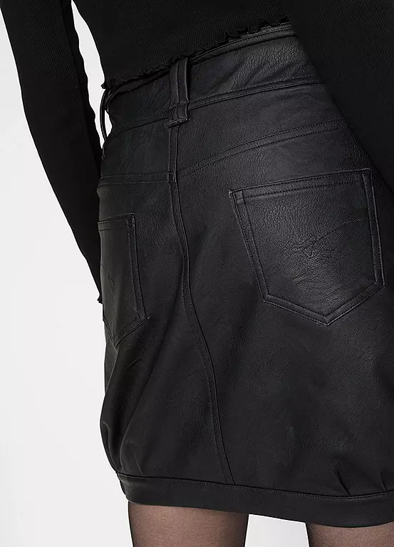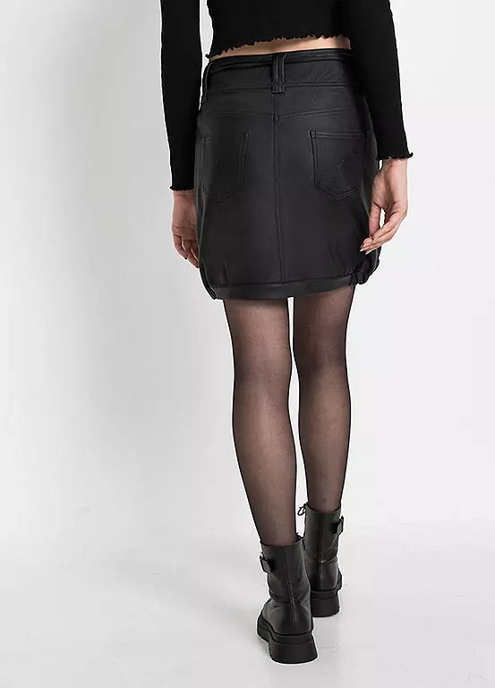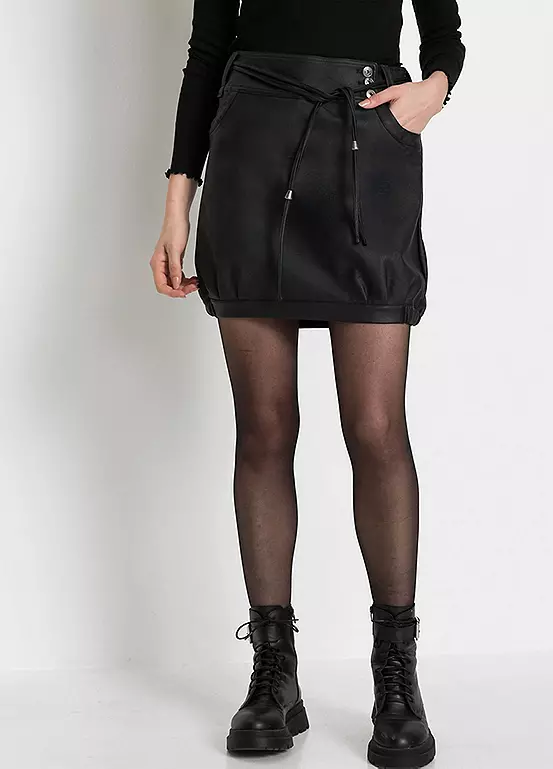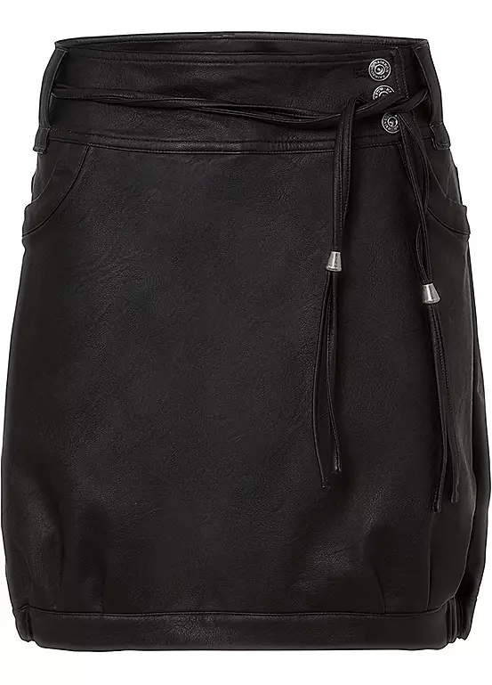 Short faux leather skirt with waist ties and side pockets. Washable. Length approx. 46 cm.