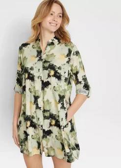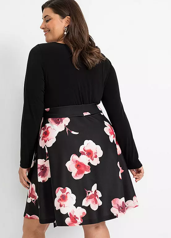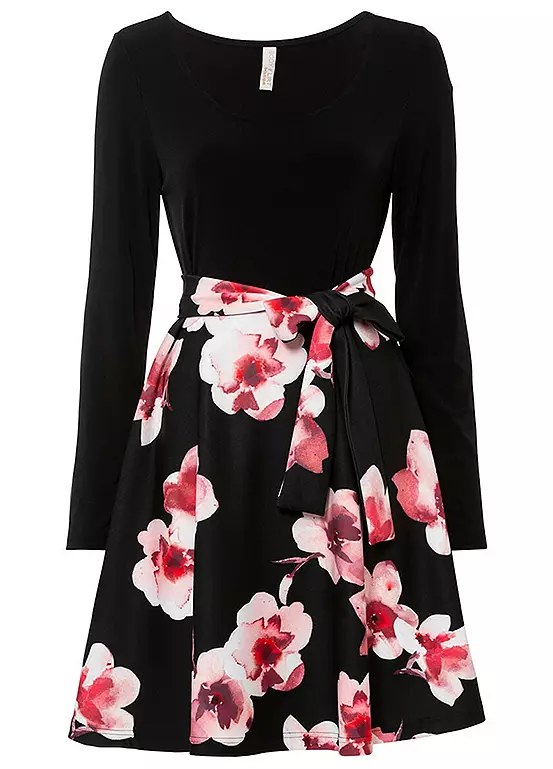 A skater dress with a plain bodice, floral print skirt and waist ties. Length approx. 90 cm.