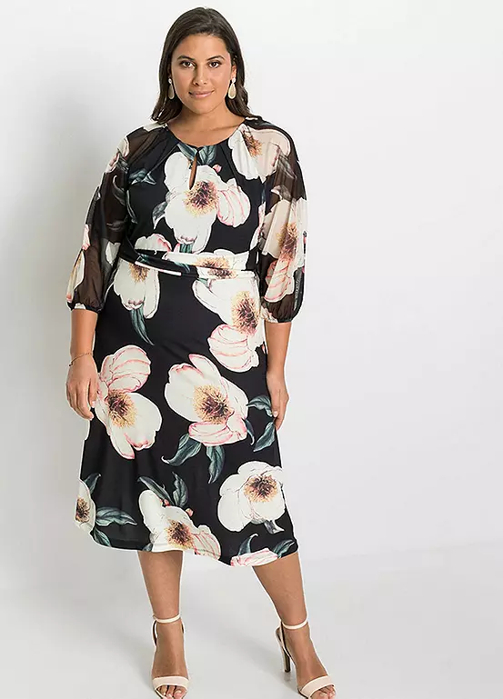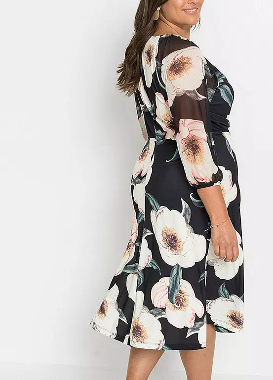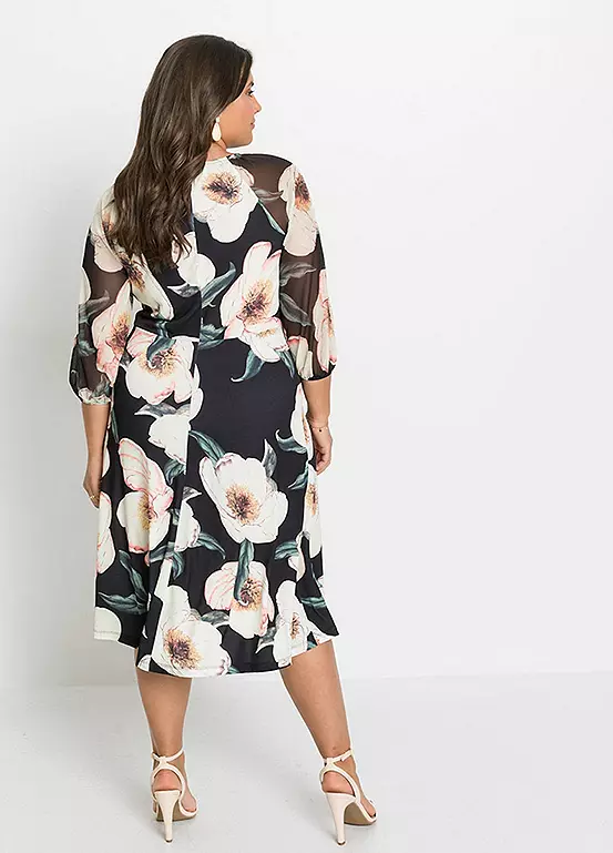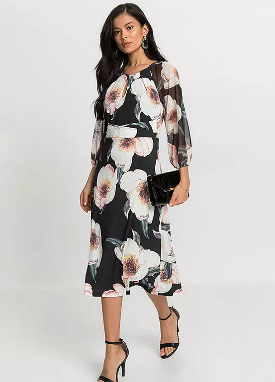Printed midi dress with sheer net sleeves. Length approx. 114 cm.