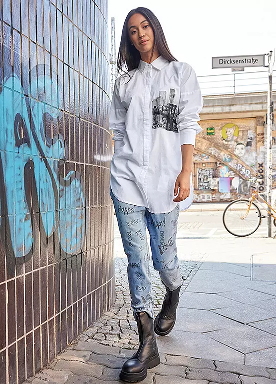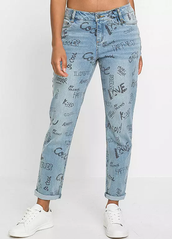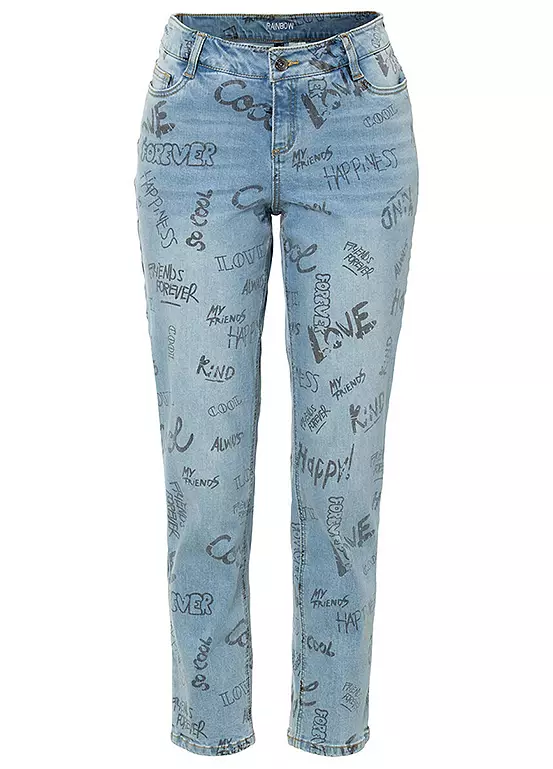 Statement print jeans in a relaxed cut. Inside leg approx. 77.5 cm.