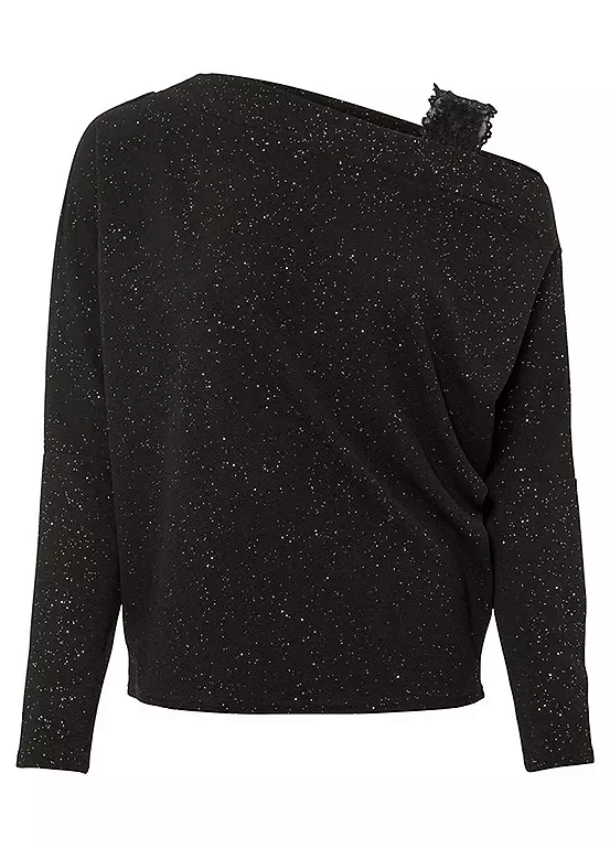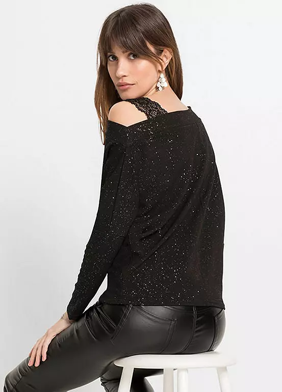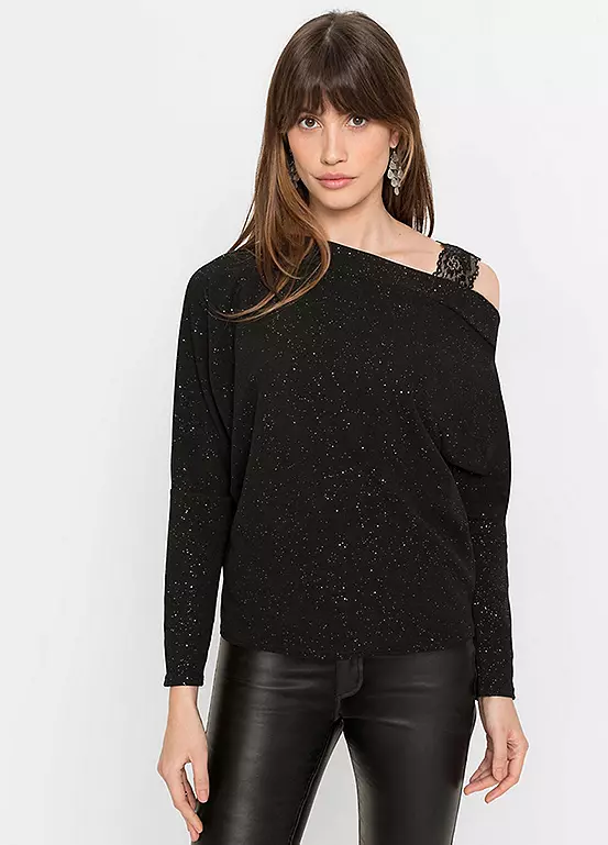 A sparkly jersey top with one shoulder strap in stylish lace and an asymmetric neckline. Length approx. 64 cm.