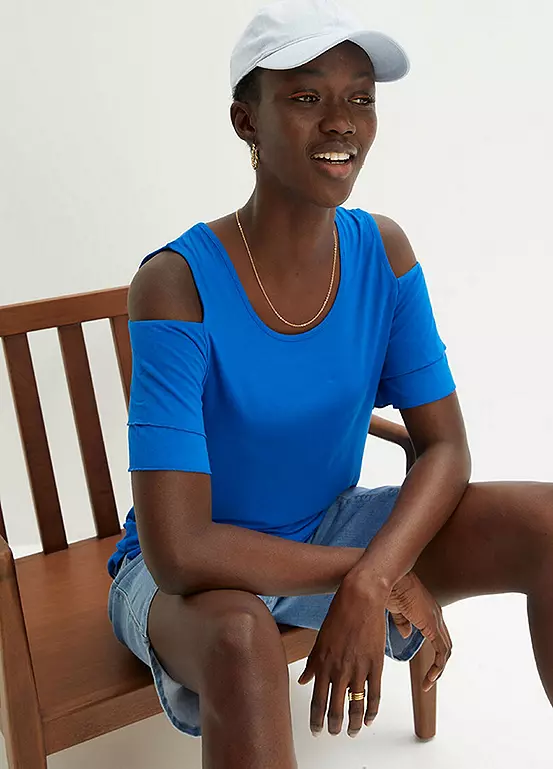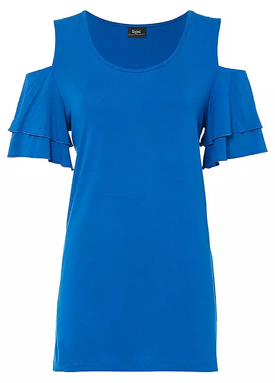 Fluted sleeve T-shirt with cut-out shoulders. Machine washable. 95% Sustainable Viscose, 5% Elastane. Length approx. 74 cm.