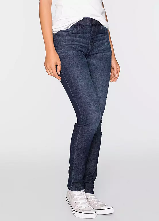 A comfy pair of blue jeggings with an elasticated waistband. Machine washable. 82% Cotton, 17% Polyester, 1% Elastane.