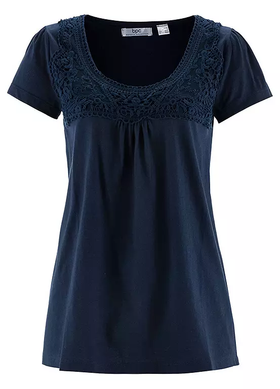 A short sleeve tunic with a lace yoke and ruching beneath the bust seam. Machine washable. 100% Cotton. Length from approx. 68 to 78 cm.