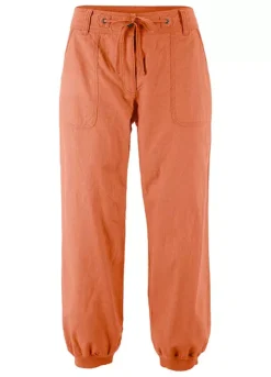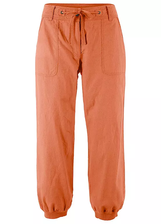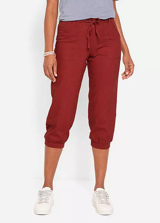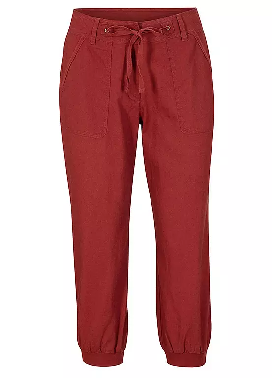 Cropped linen trousers with a ribbed waist. Machine washable.