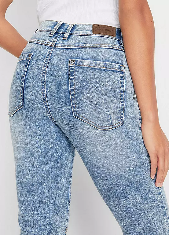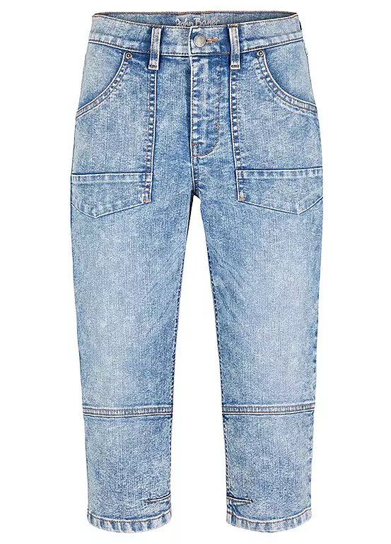 A pair of stretchy denim jeans with large pockets and a cropped leg. Machine washable. 82% Cotton, 17% Polyester, 1% Elastane.