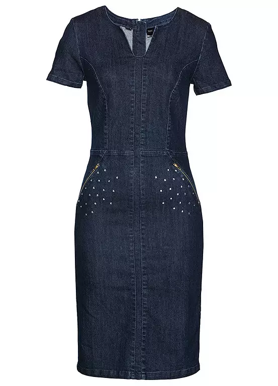 A fitted denim dress with studding at the waist and zip fastening at the back. Machine washable. 82% Cotton, 17% Polyester, 1% Elastane. Length from approx. 98 – 104 cm.