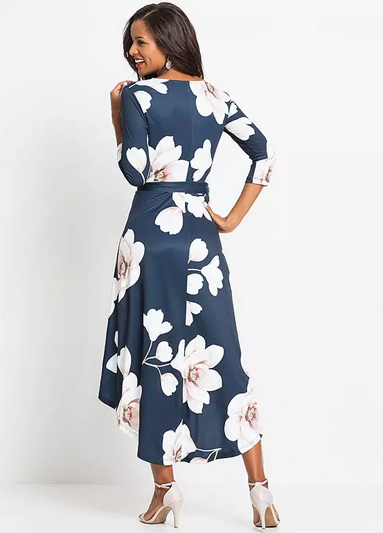 An elegant floral print dress with a flattering v-neck and a hi-lo skirt. Machine washable. 95% Polyester, 5% Elastane. Length approx. 140 cm.