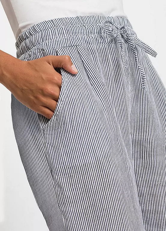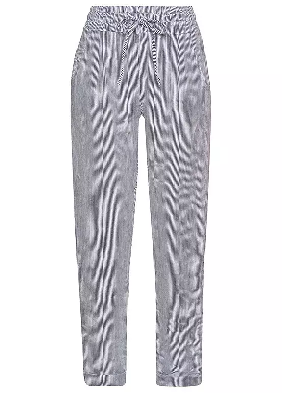 These trousers come with an elasticated drawstring waist and side pockets. The linen-cotton material is perfect for keeping you cool on a hot day. Machine washable. 55% Linen, 45% Cotton.