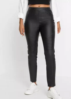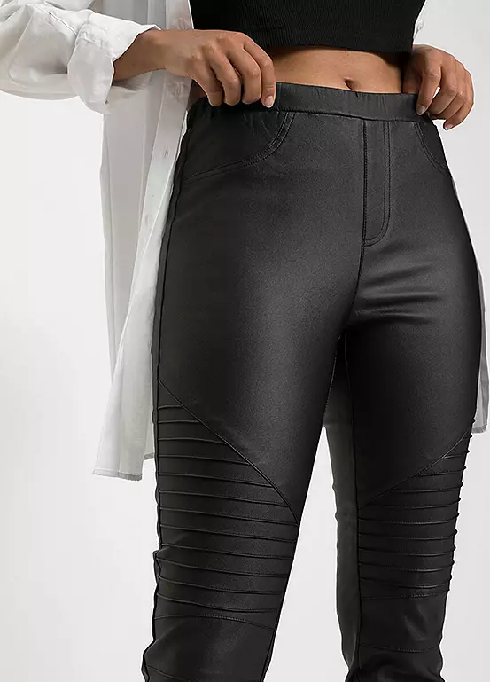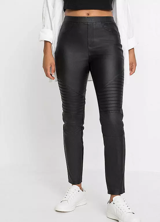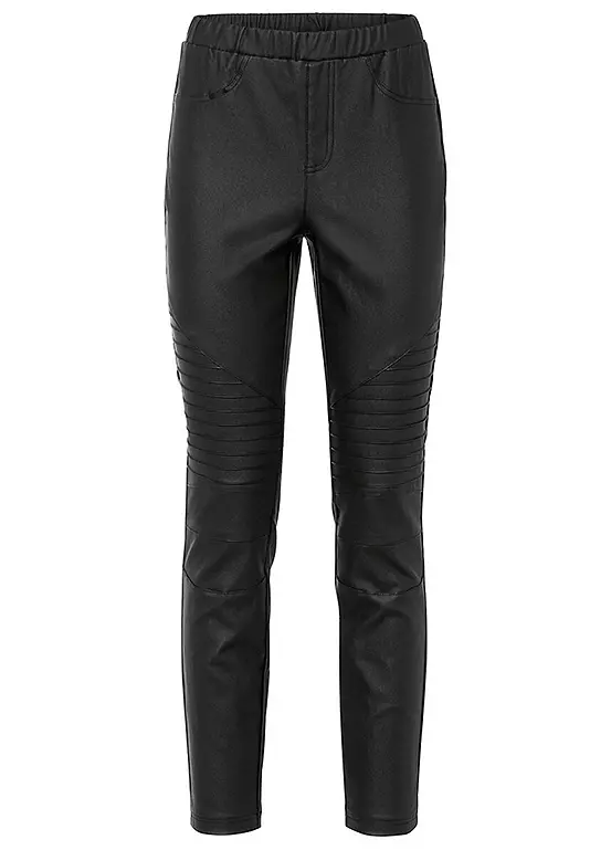 Faux leather trousers with biker detailing. Inside leg approx. 71.5 cm.