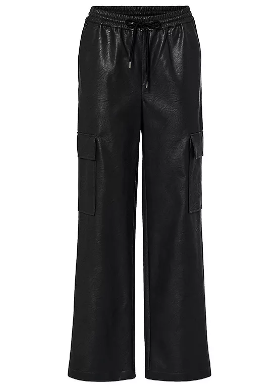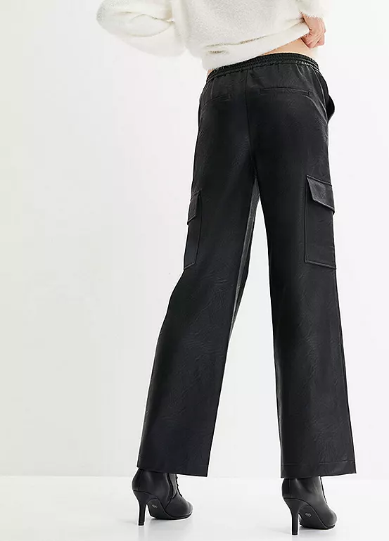 Wide leg trousers in faux leather with an elasticated waist. Inside leg approx. 77.5 cm.