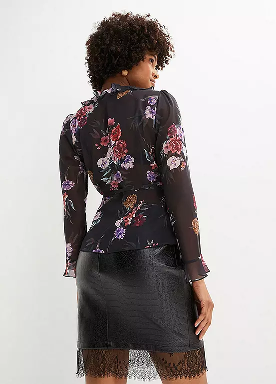 Semi-sheer blouse with a low V-neck and a floral print. Machine washable. 100% Recycled Polyester. Length approx. 62 cm.