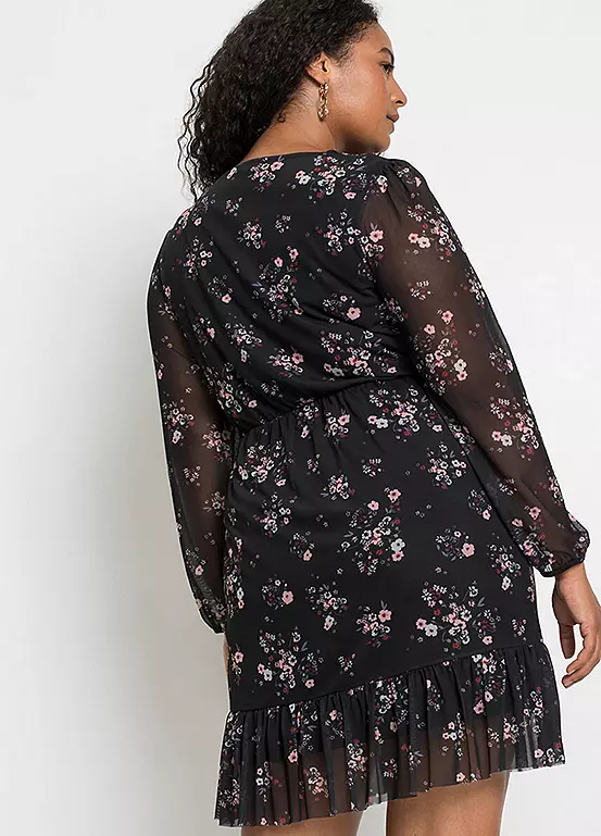 Floral skater dress with sheer net sleeves. Machine washable. Shell: 96% Polyester, 4% Elastane. Lining: 100% Polyester. Length approx. 94 cm.