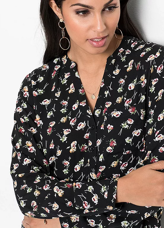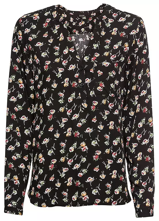 A v-neck blouse with a chest pocket, a dipped back hem and a ditsy floral pattern. Machine washable. 100% Viscose. Length approx. 70 cm.