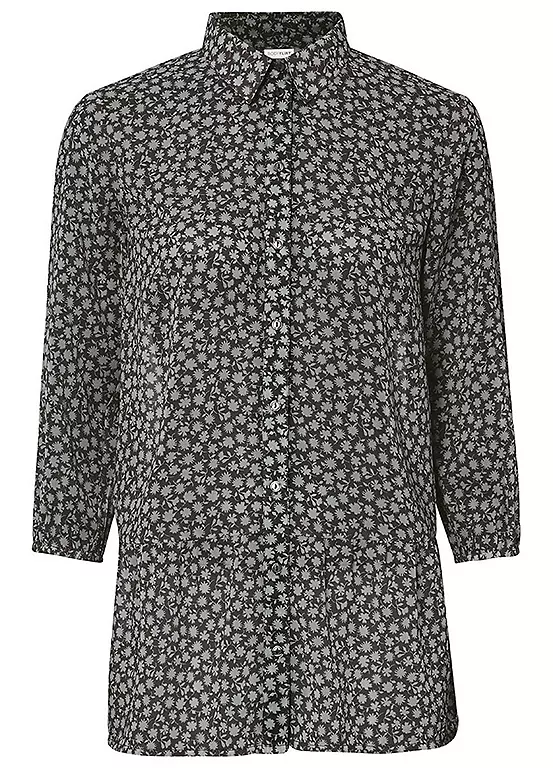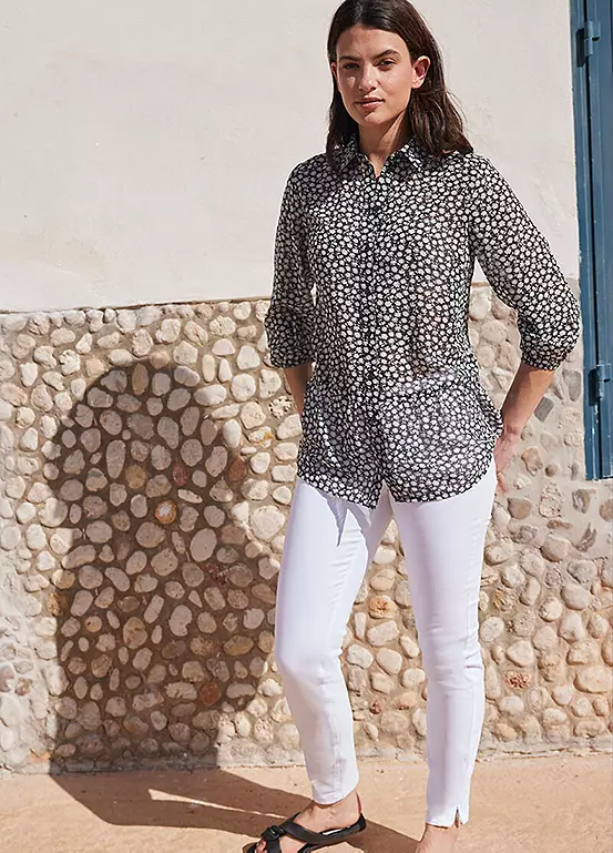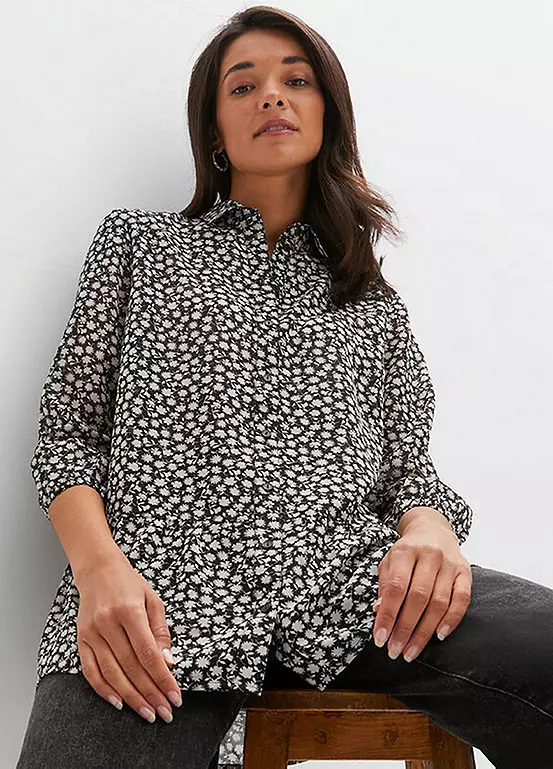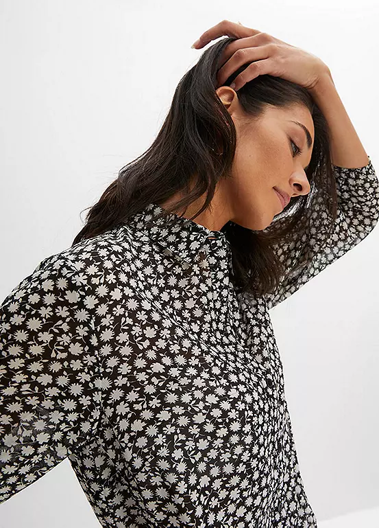 Fashionable chiffon blouse with a cute floral print and flounced hem. Washable. Length approx. 70 cm.