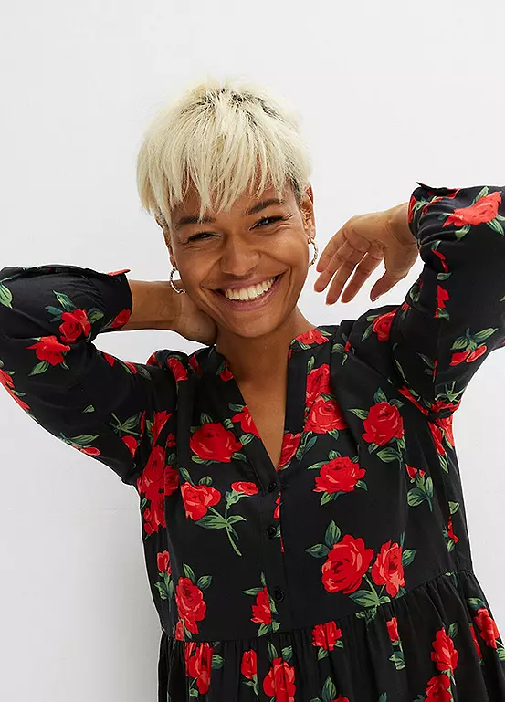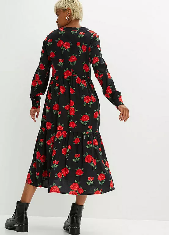 A fashionable midi length dress with a V-neck bodice and a floral pattern. Length approx. 120 cm.