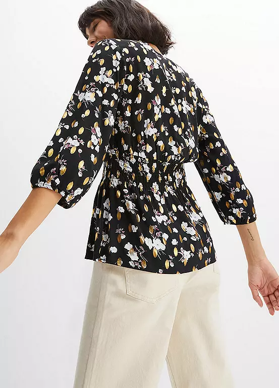 Floral print wrap blouse with a smock insert and three-quarter sleeves. Machine washable. 100% Viscose. Length approx. 66 cm.