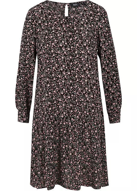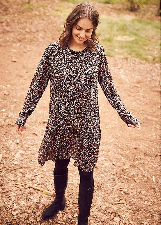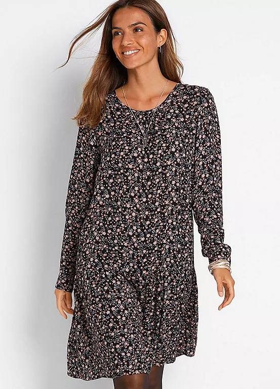 A long sleeve dress with flouncing. Machine washable. 100% Viscose. Length approx. 100 cm.