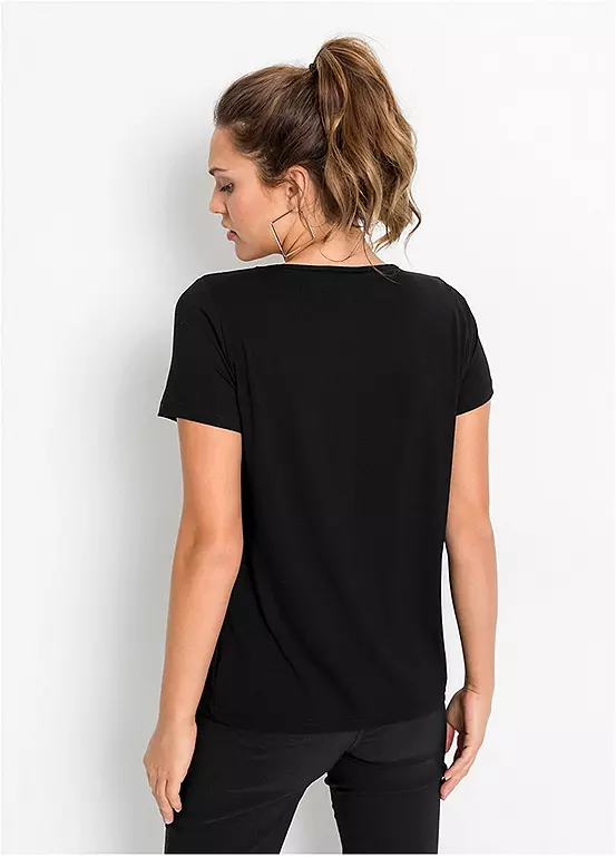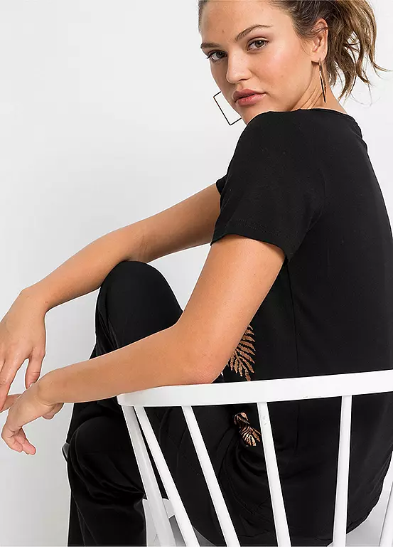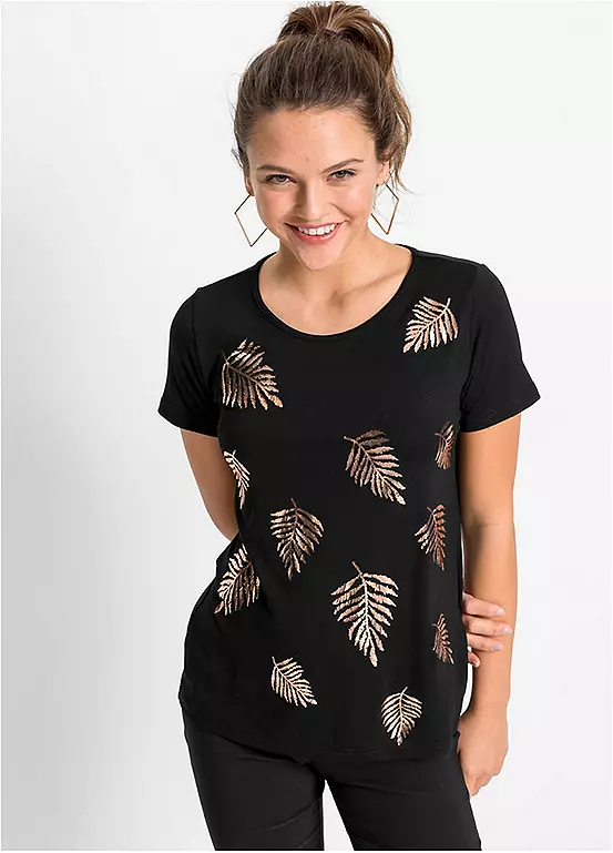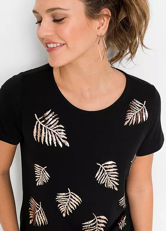 Glitter-leaf print top with short sleeves and a round neckline. 95% Viscose, 5% Elastane. Length approx. 66 cm.