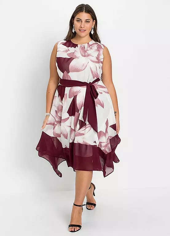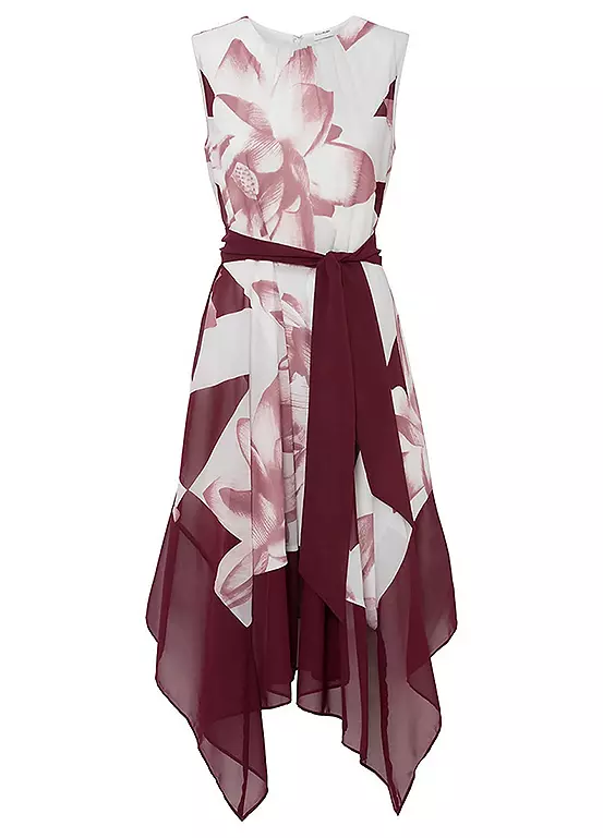 An elegant dress with a floral print and a solid hanky hem. Lined. 100% Polyester, Lining: 100% Polyester. Length approx. 140 cm.
