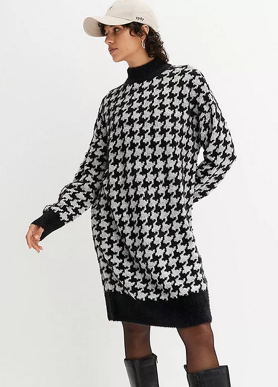 Knitted dress with houndstooth checks. Machine washable. 74% Polyamide, 17% Viscose, 9% Polyester. Length approx. 90 cm.