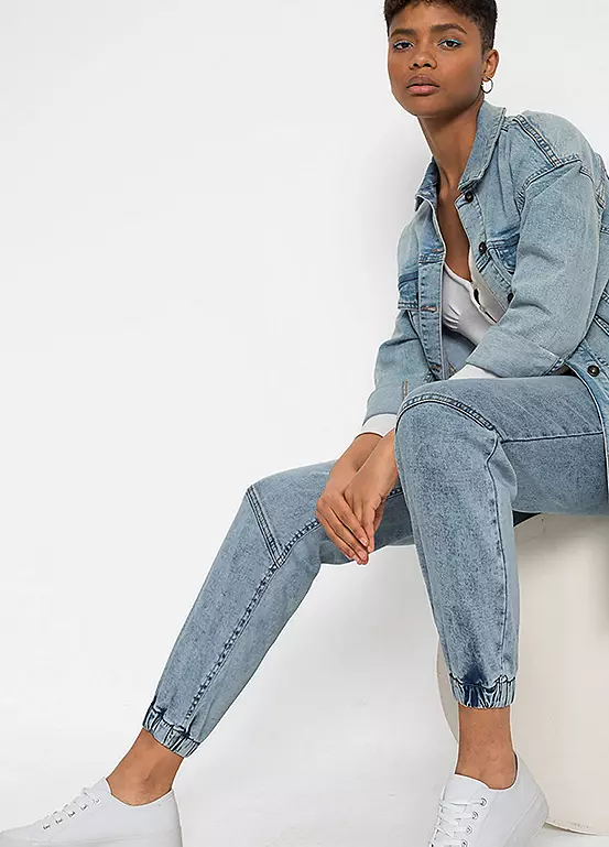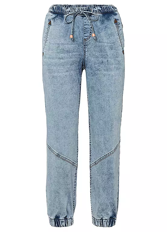 Pull on denim jeans with cuffed hems. Machine washable. 98% Cotton, 2% Elastane.