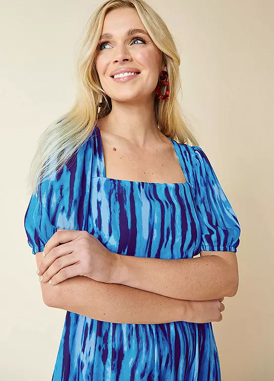 Stand out in this square neckline dress featuring a stunning print with a mixture of blues. Featuring puff sleeves, a cut out back and ruching at the sides. Team with a pair of wedges for a moonlight meal on the beach. Washable. Length approx. 122 cm (48 in).