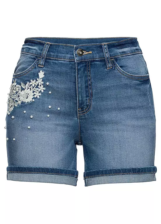 A pair of stonewash hot pants with beading and lace detailing. 90% Cotton, 9% Elastomultiester, 1% Elastane.