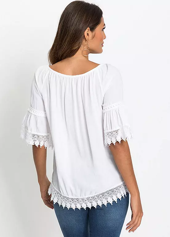 Floaty tunic with lace trim and flouncing. Length approx. 66 cm.
