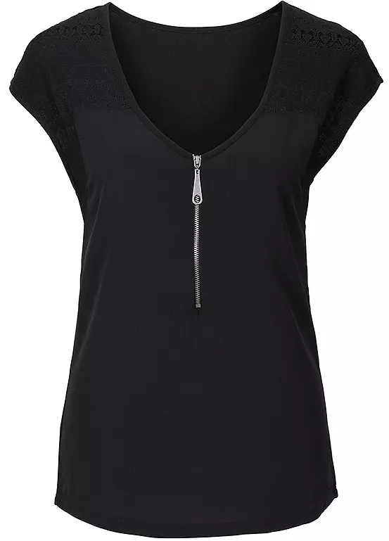 With its sheer lace shoulders and sexy zip v-neck, this capped sleeve top can be dressed up or down depending on the occasion! Machine washable. 95% Viscose, 5% Elastane. Length approx. 66 cm.