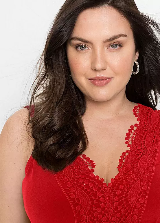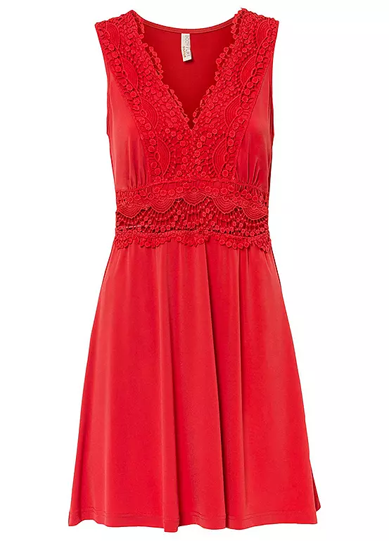 A short dress with floral lace trim. 95% Polyester, 5% Elastane. Length approx. 86 cm.