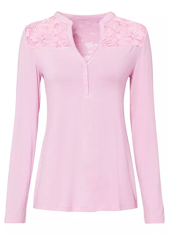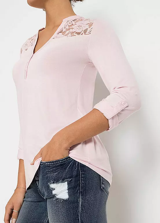A tab sleeve viscose tunic with a sheer lace shoulder yoke and a button panel at the v-neck. Machine washable. 95% Viscose, 5% Elastane. Length approx. 70 cm.