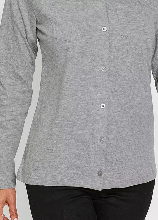 A long sleeve jersey shirt with a button fastening. Machine washable. 85% Cotton, 15% Polyester. Length approx. 63 cm.