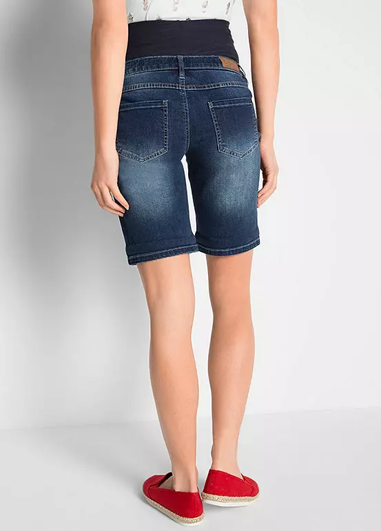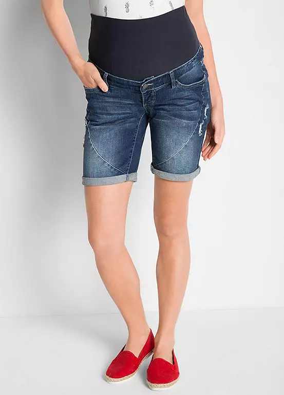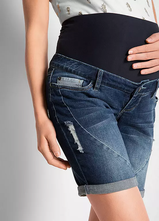 A pair of denim shorts in a classic 5 pocket cut with an adjustable waist and a high jersey band for gentle support around your bump. Machine washable. Shell: 95% Cotton, 4% Polyester, 1% Elastane, Cuff: 95% Cotton, 5% Elastane.
