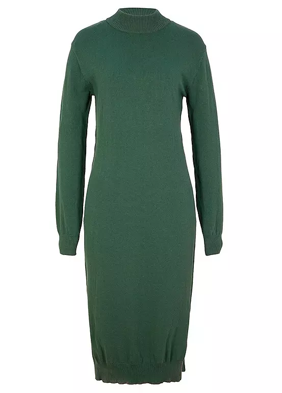 A smooth knit dress with a turtleneck collar. Machine washable. Length approx. 108 cm.