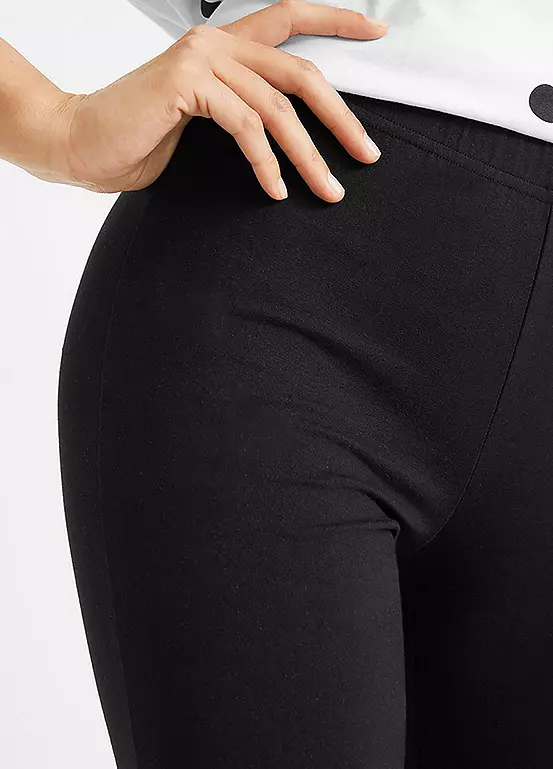 Two pairs of stretchy cotton leggings with a short leg. Machine washable. 95% Cotton, 5% Elastane. Length approx. 30 cm.