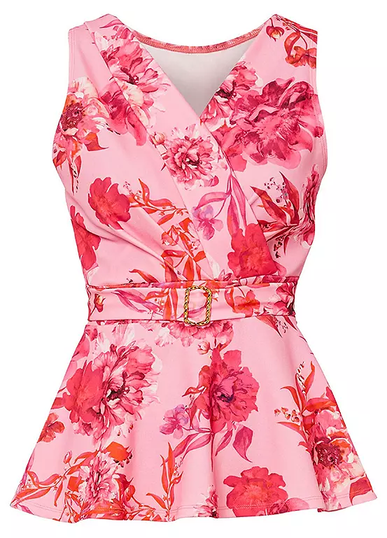 Wrap top with a gold buckle belt and a peplum hem. 95% Polyester, 5% Elastane. Length approx. 64 cm.