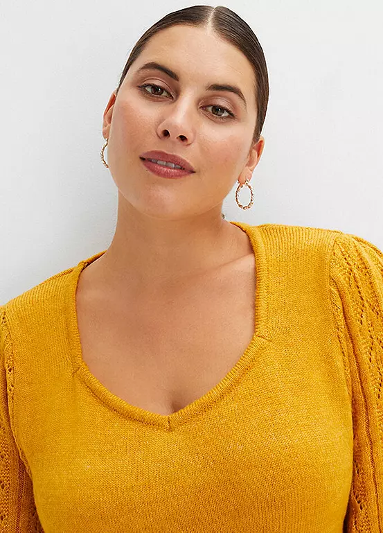 Scoop neck knitted dress with pointelle sleeves. Length approx. 94 cm.
