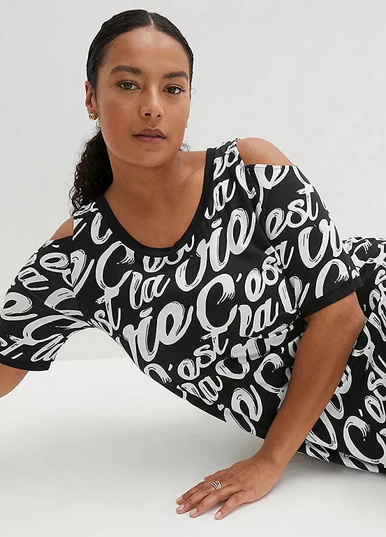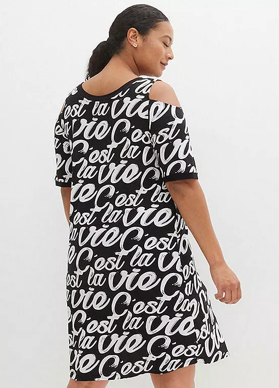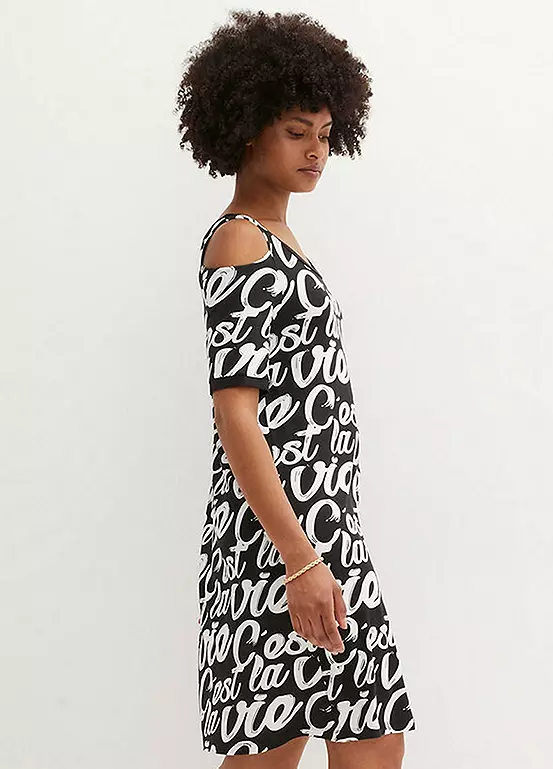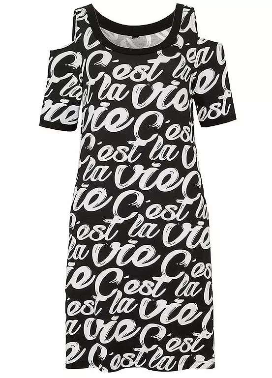 A charming dress in stretchy jersey with cut-out shoulders and ’c’est la vie’ all-over print. Washable. Length approx. 94 cm.