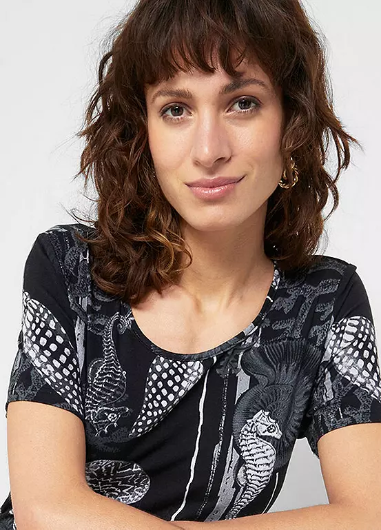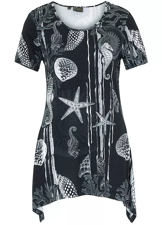 A printed short sleeve tunic with a hanky hem. Machine washable. Length approx. 72 cm.