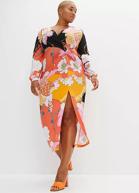 Brightly printed dress with a wrap bodice and ruching at the waist. Length approx. 136 cm.