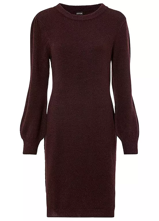 Crew neck knit dress with long puff sleeves. Length approx. 94 cm.