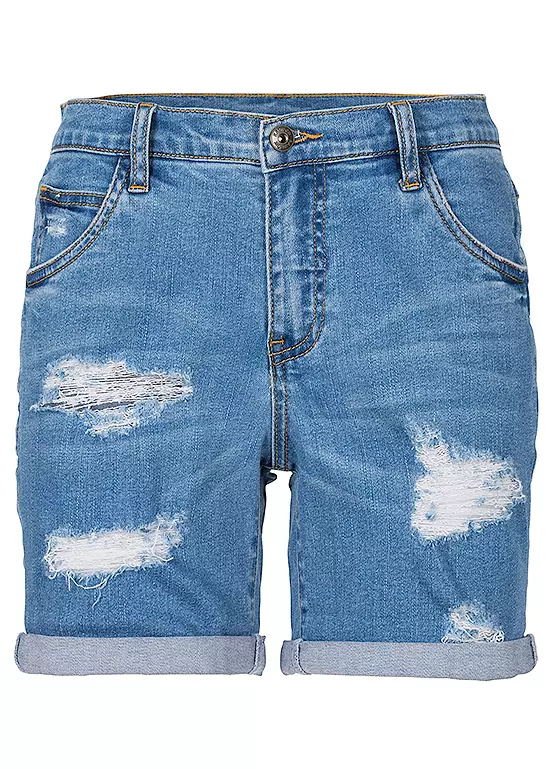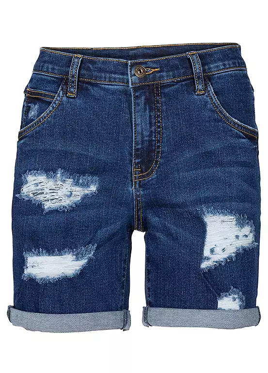 A cute pair of summer shorts in distressed denim with turn-up hems. Machine washable. 95% Cotton, 4% Polyester, 1% Elastane. Inside leg with turn-ups approx. 12.5 cm.