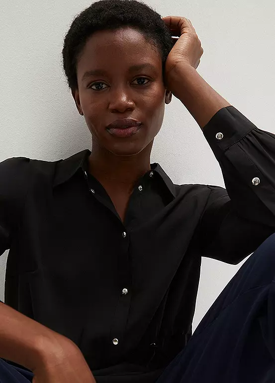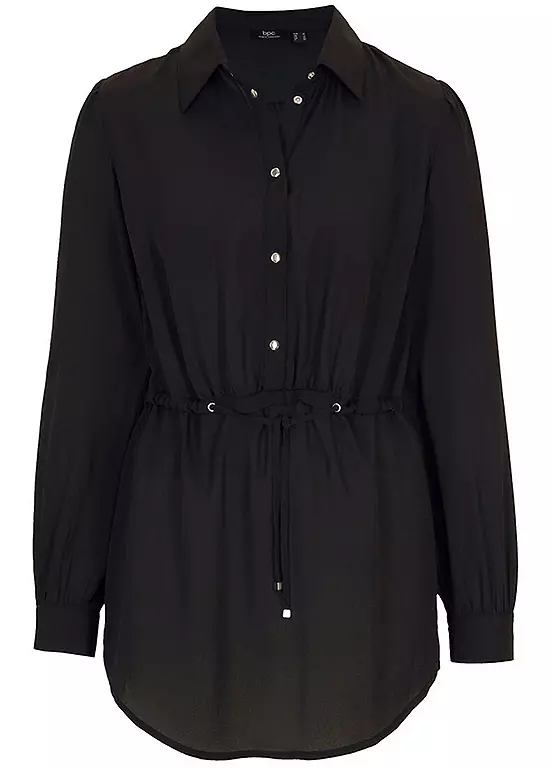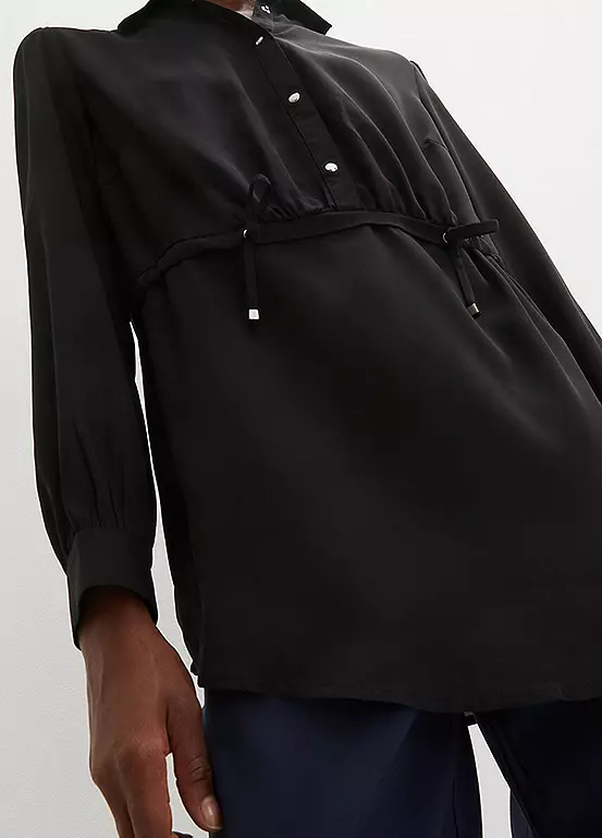 Lightweight blouse with ties to ruch the waist. Length approx. 76 cm.