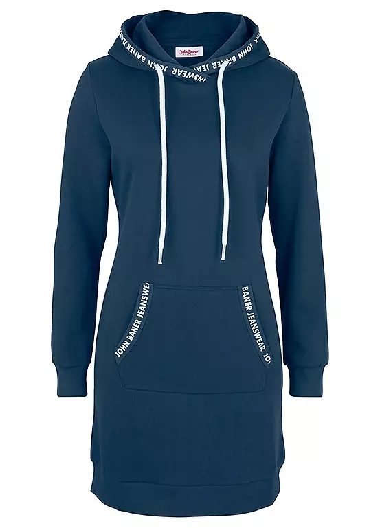 A hooded dress with sporty piping around the collar and pouch pocket. Machine washable. Length approx. 92 cm.