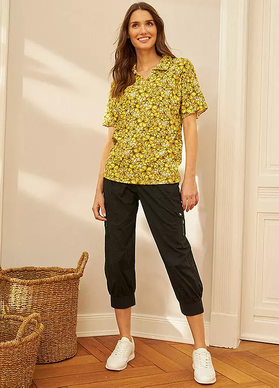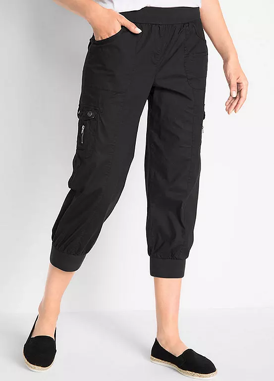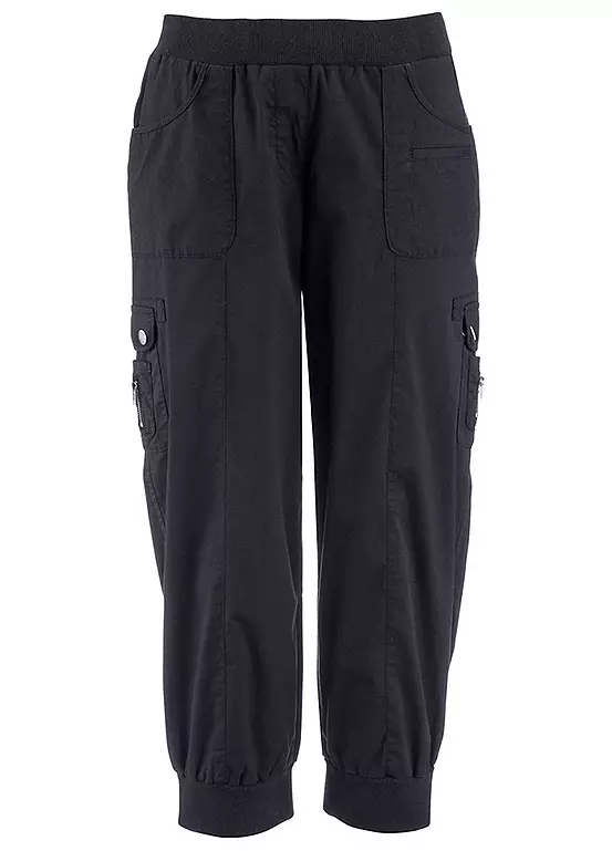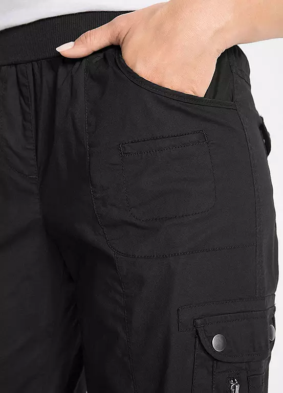 Stretch waist cargo pants with studded and zips at the front and back. Machine washable. Inside leg approx. 59 cm.