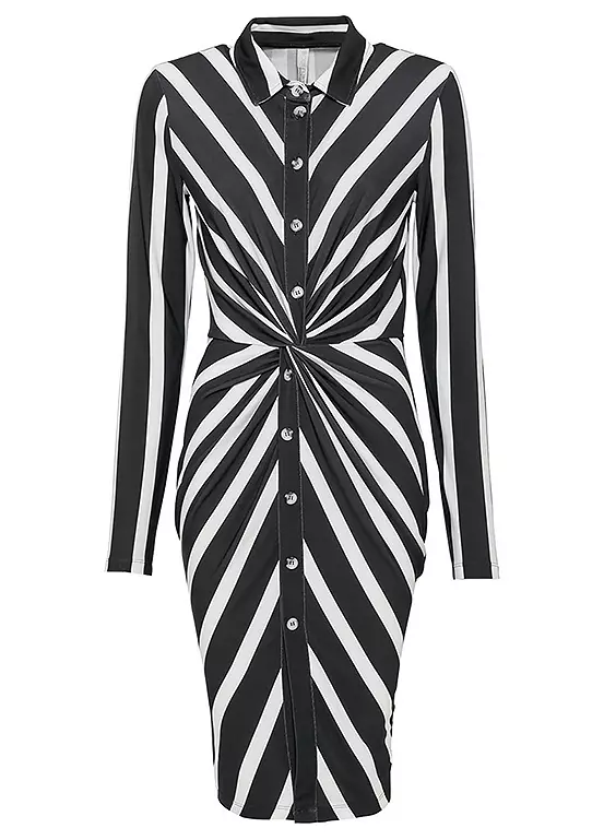 A stripy dress with a button fastening and a knotted design at the waist. Machine washable. 95% Polyester, 5% Elastane. Length approx. 94 cm.