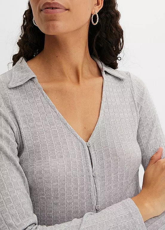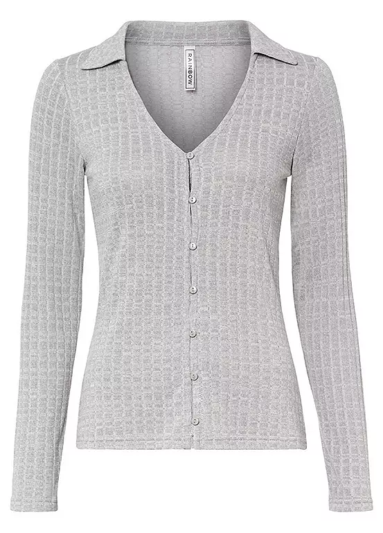 Plunging V-neck blouse in textured jersey with button fastening. Machine washable. 55% Viscose, 42% Polyester, 3% Elastane. Length approx. 60 cm.