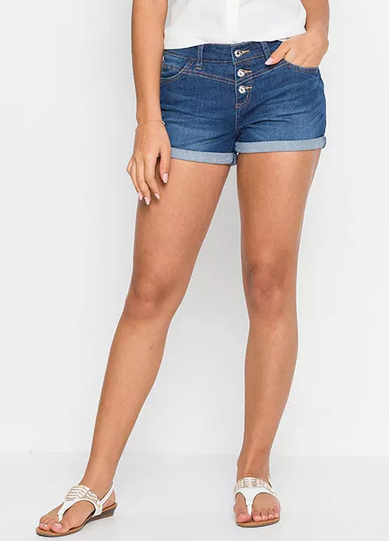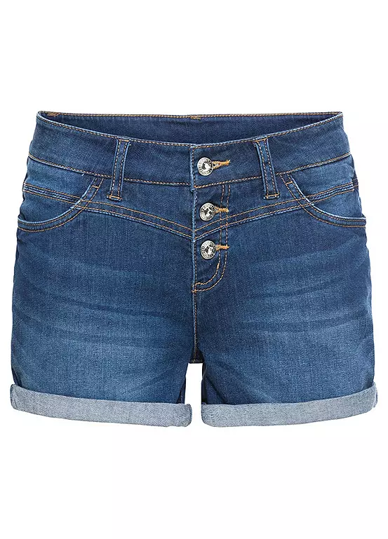 These stretchy denim shorts come with turn-up hems and a button fly. Machine washable. 90% Cotton, 9% Elastomultiester, 1% Elastane.
